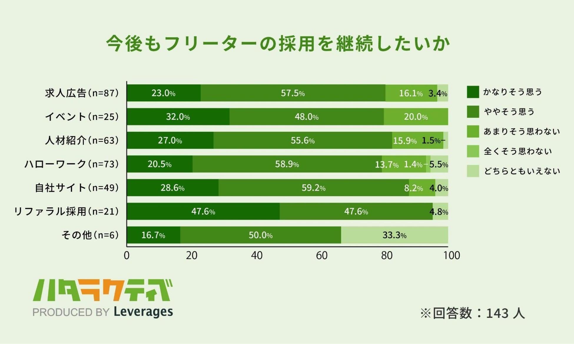 フリーター採用の手法としてリファラル採用をしている企業の約9割が「今後もフリーター採用を継続したい」と回答しました。一方で、フリーターの採用手法で最も多かったのは、「求人広告」