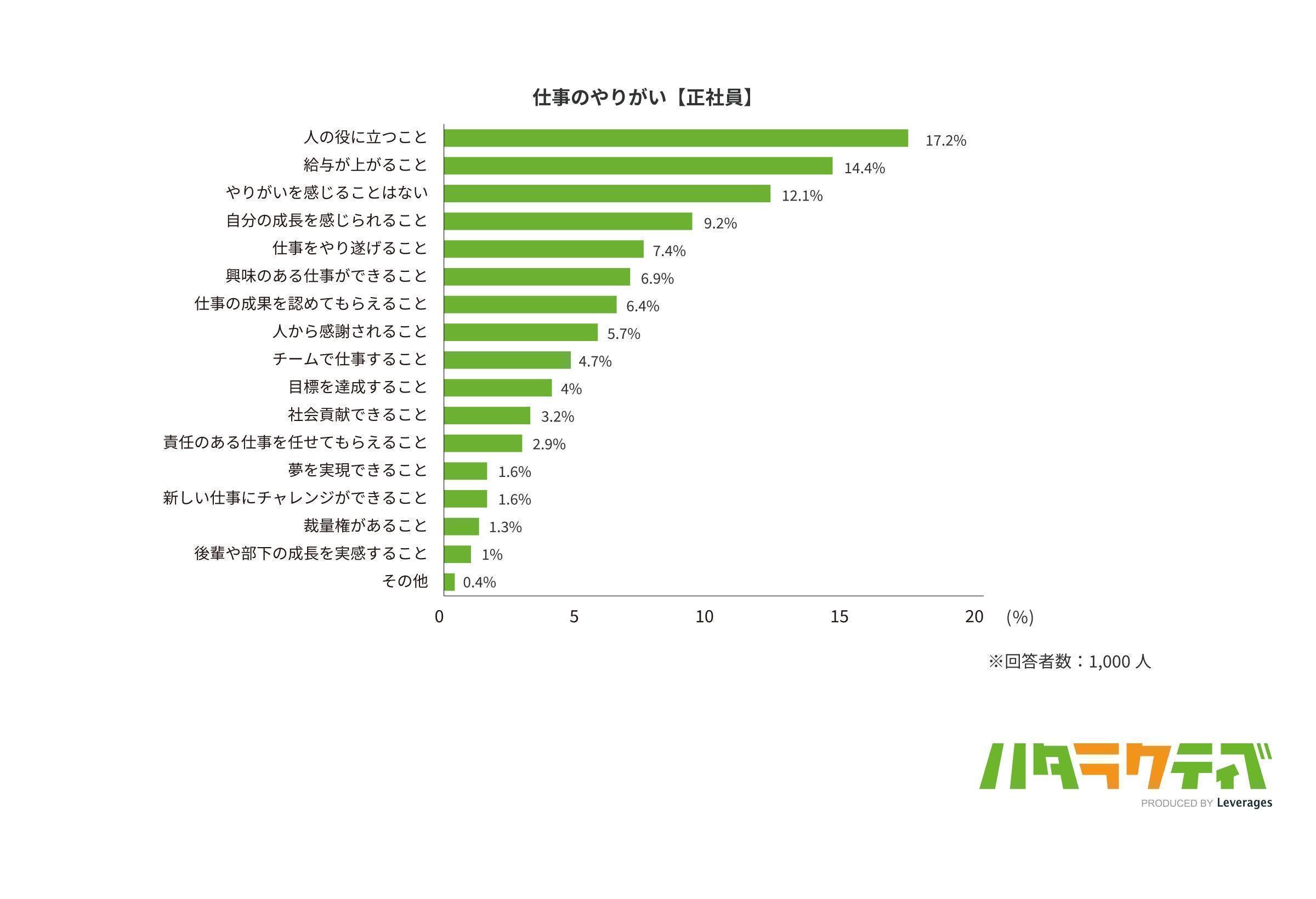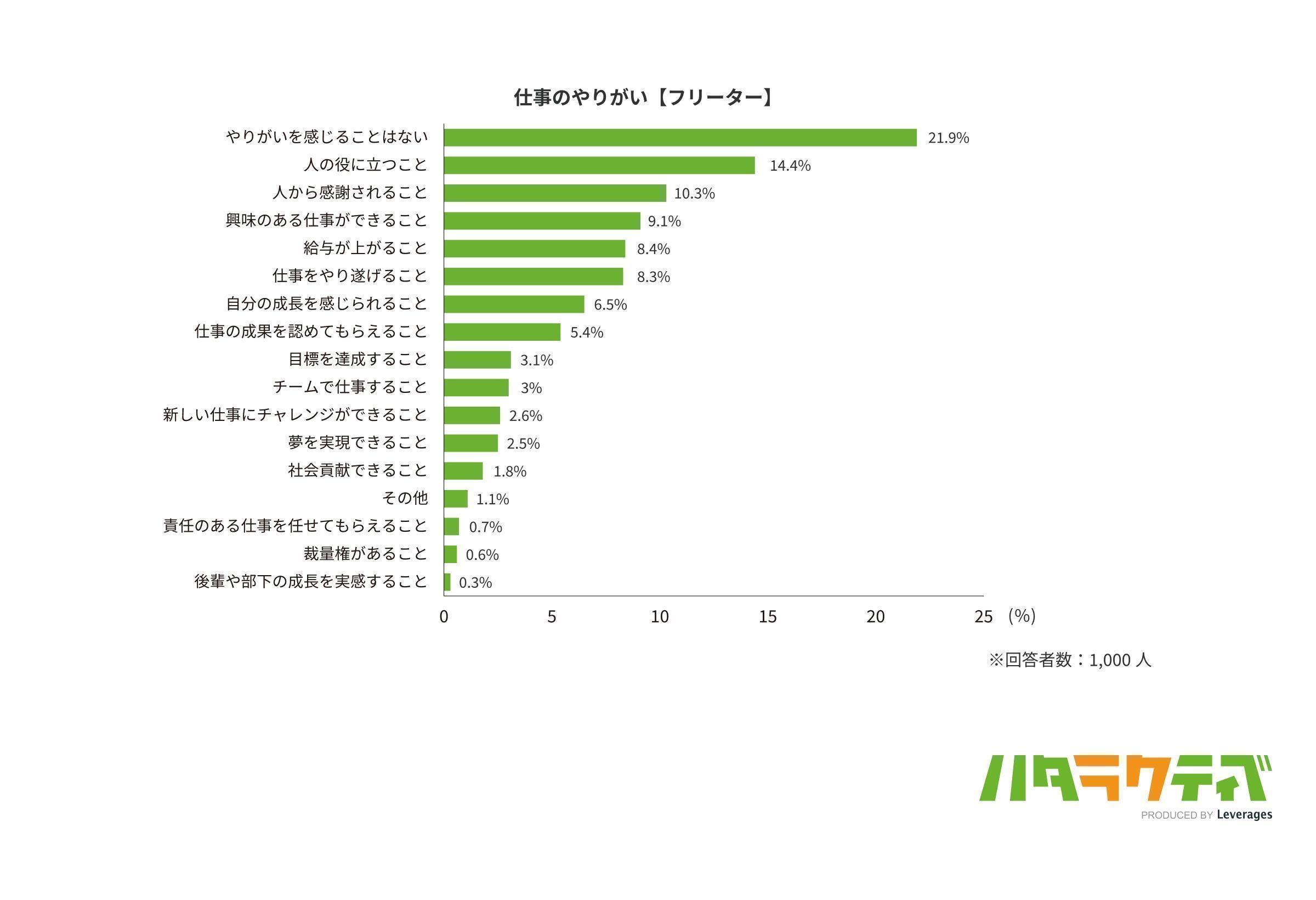 仕事のやりがいは、正社員・フリーターともに「人の役に立つこと」が上位に挙げられました。正社員は「給与が上がること(14.4%)」の回答が2番目に多い結果となり、一方で、フリーターとして勤務している人は仕事に対し、2割が「やりがいを感じない」と回答しました。