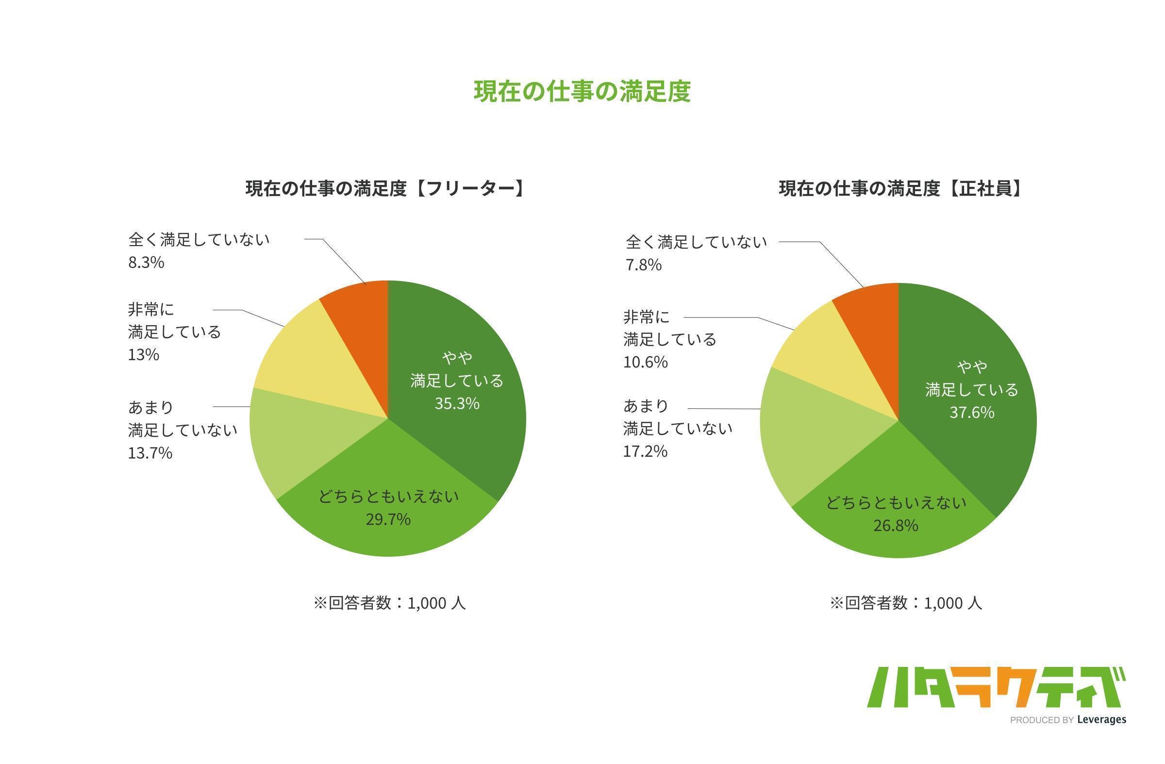 一方で、現在の仕事の満足度について、正社員もフリーターも「やや満足している」がもっとも多い回答となり、差は見られませんでした。
