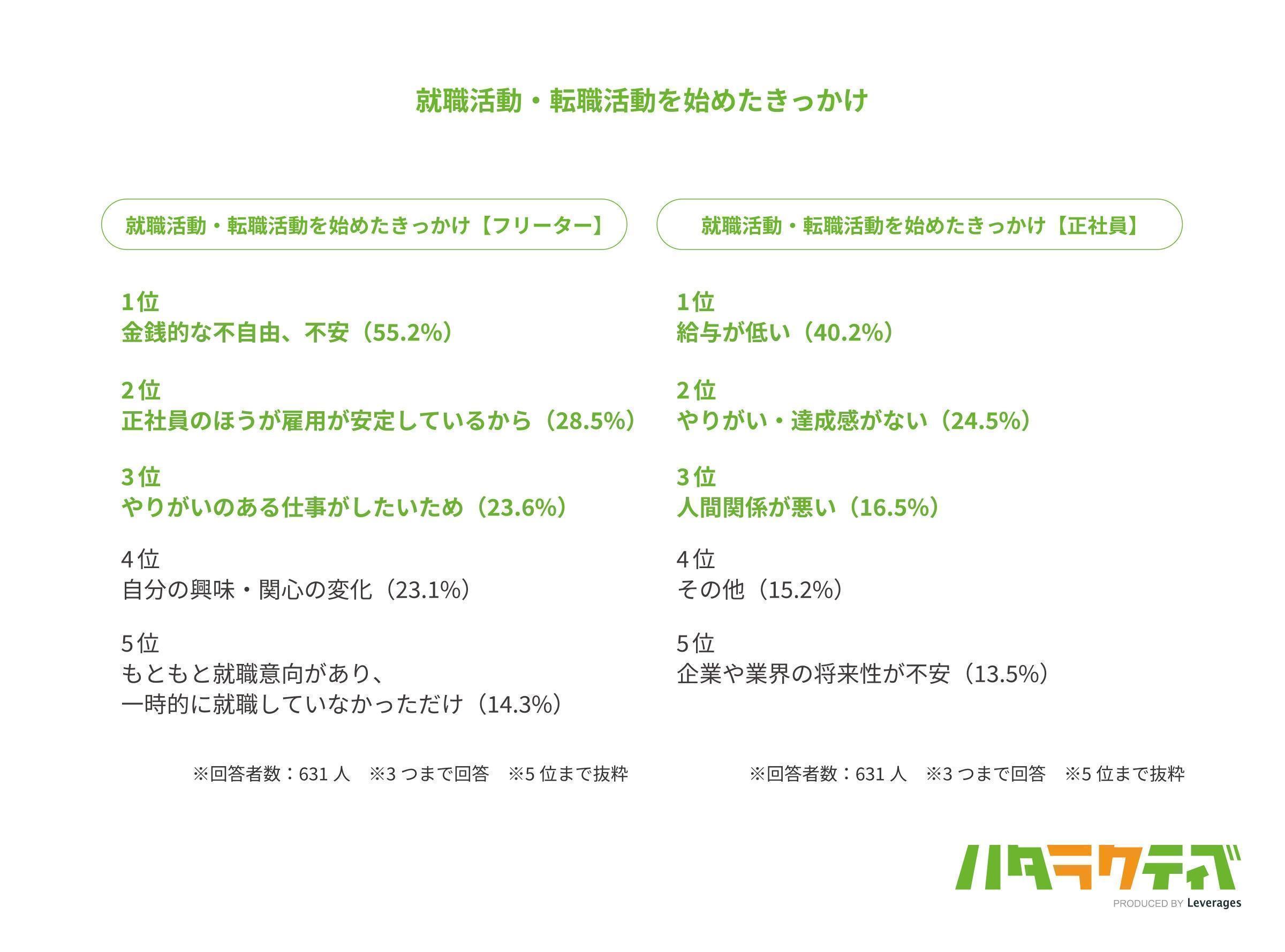 就職活動・転職活動を始めたきっかけ、正社員・フリーターともに約半数が「金銭面の不安や不満」