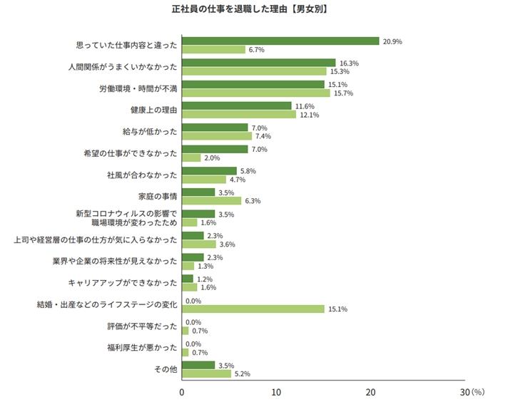 「思っていた仕事内容と違った」という理由で退職を決める人は多いようです。ハタラクティブの独自調査である「若者しごと白書2025」によると、正社員の仕事を退職した理由のうち、「思っていた仕事内容と違った」と感じた人は、男性で最も多い20.9%でした。