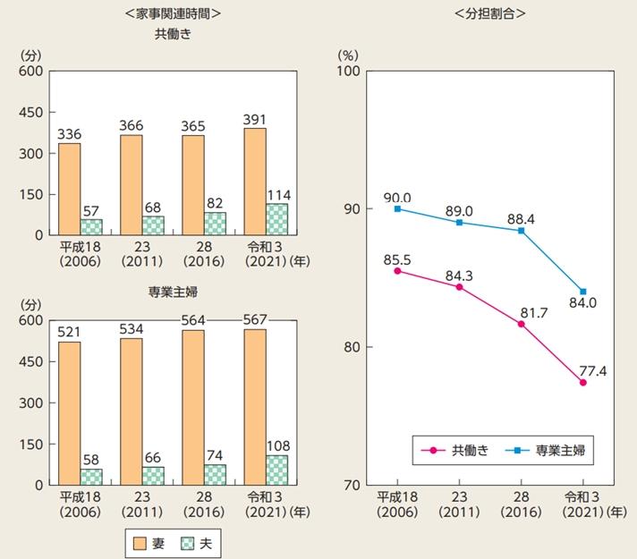 参照:内閣府男女共同参画局「特-8図 6歳未満の子供を持つ妻・夫の家事関連時間及び妻の分担割合の推移(週全体平均)(p14)」