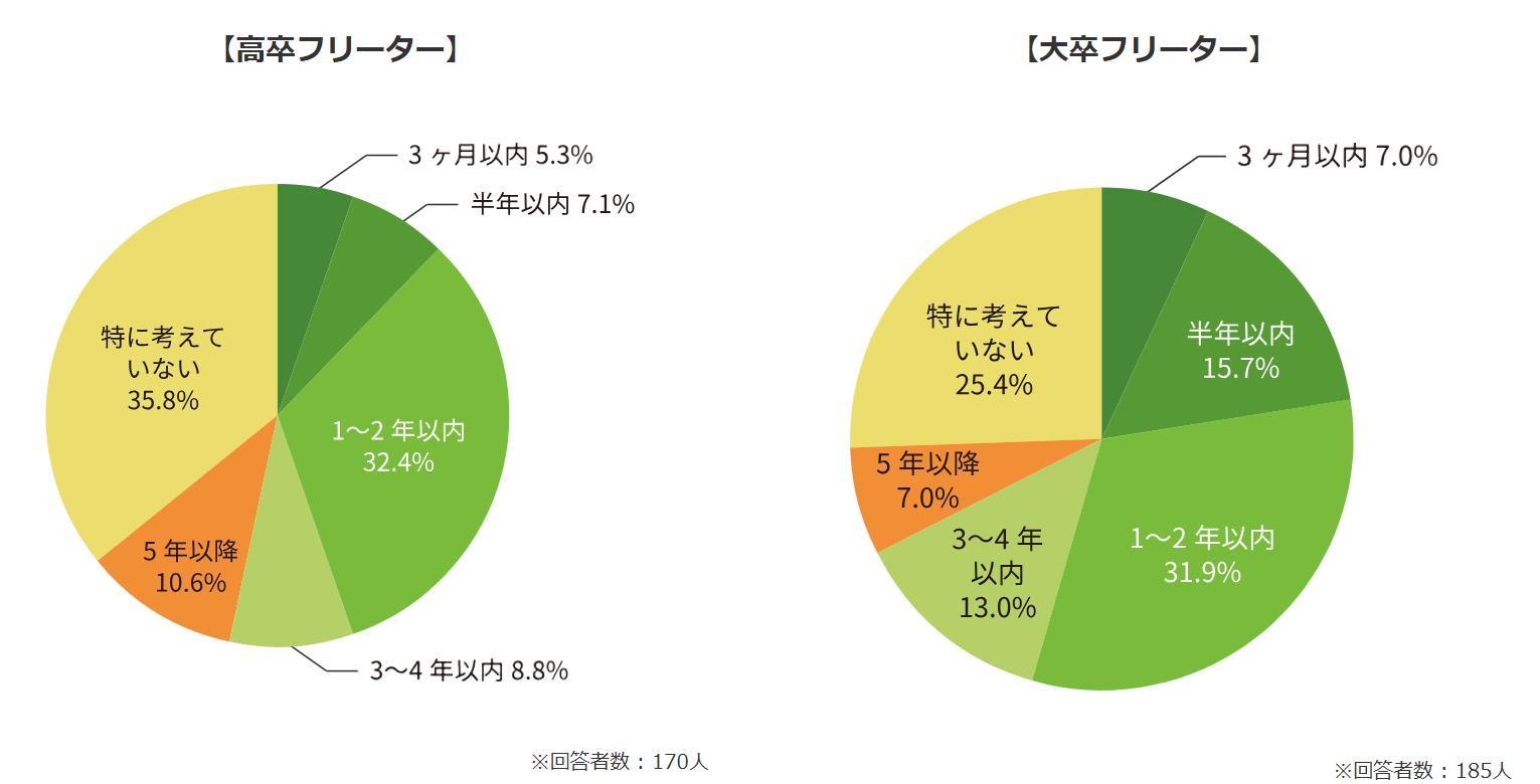 高卒フリーターで「1~2年以内」と答えた割合は32.4%、大卒フリーターでは31.9%。一方で、「特に考えていない」と答えた割合は、高卒フリーターでは35.8%、大卒フリーターでは25.4%でした。